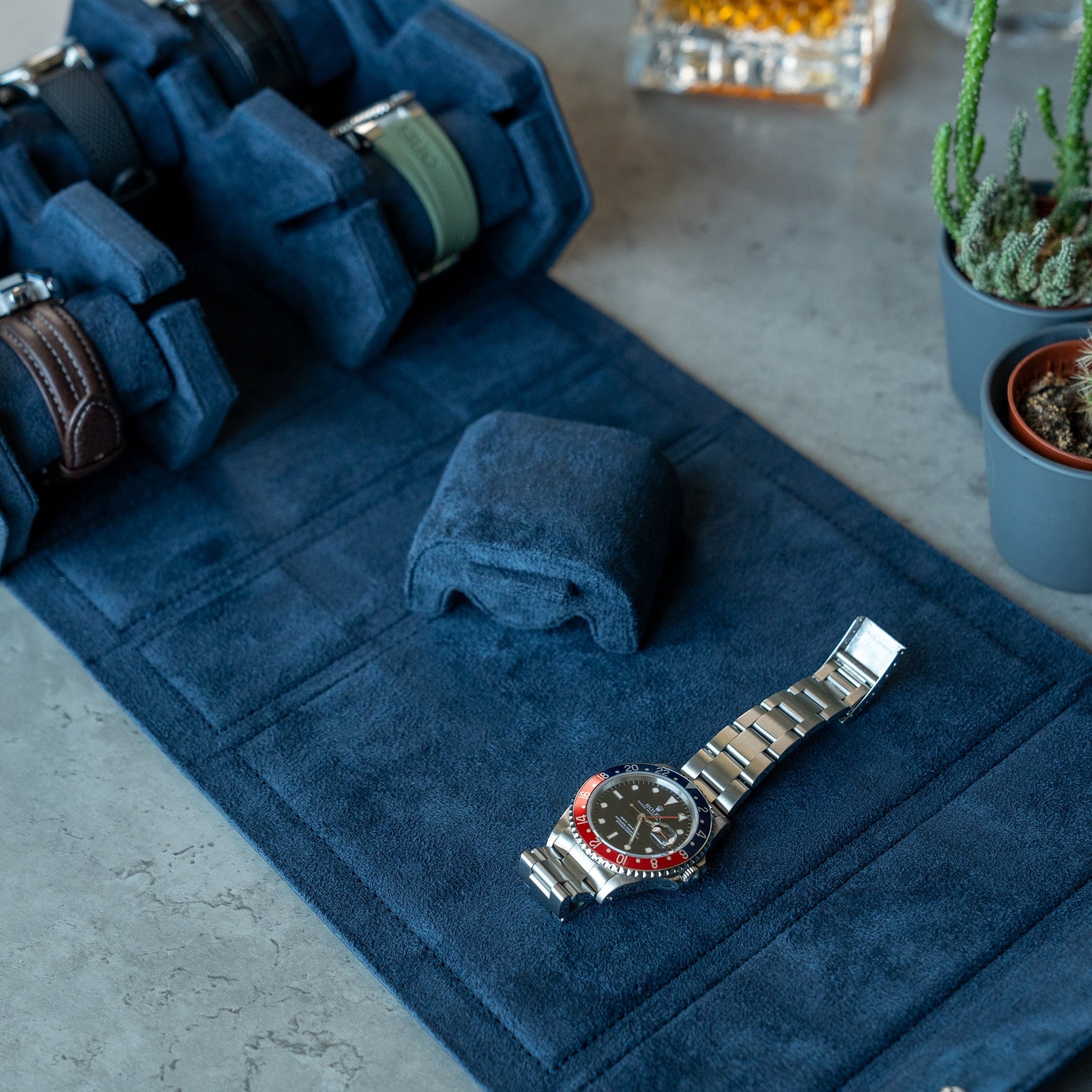 A perfect mix between a watch roll and a watch box. Introducing our watch box for 6 watches with removable cushions for each individual watch using a sliding system. It's specifically designed for watch enthusiasts and watch collectors to protect their prized possessions - whether it is for traveling or to store it at home. The Watch Box is hand made of fine genuine navy blue litchi leather and holds up to six watches.