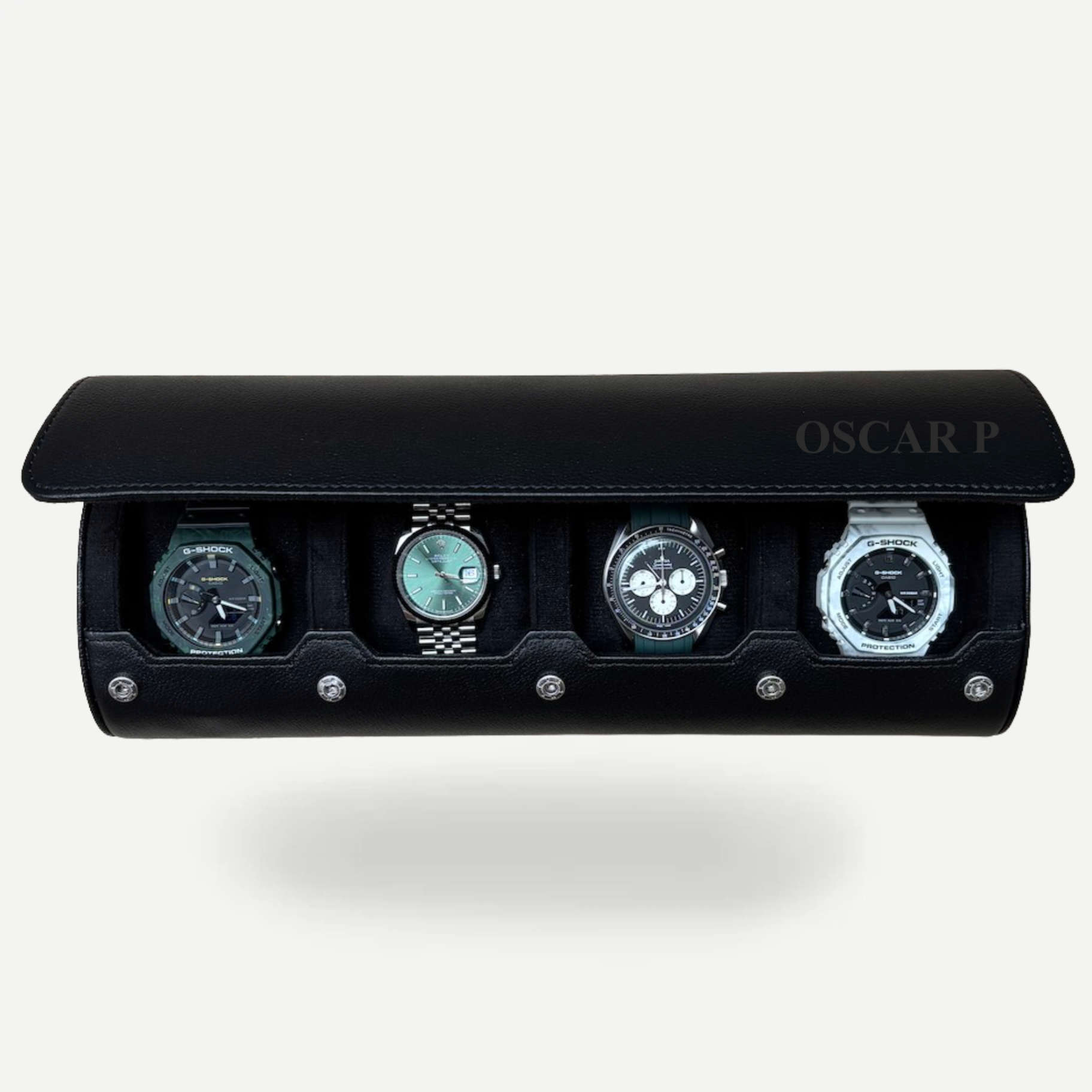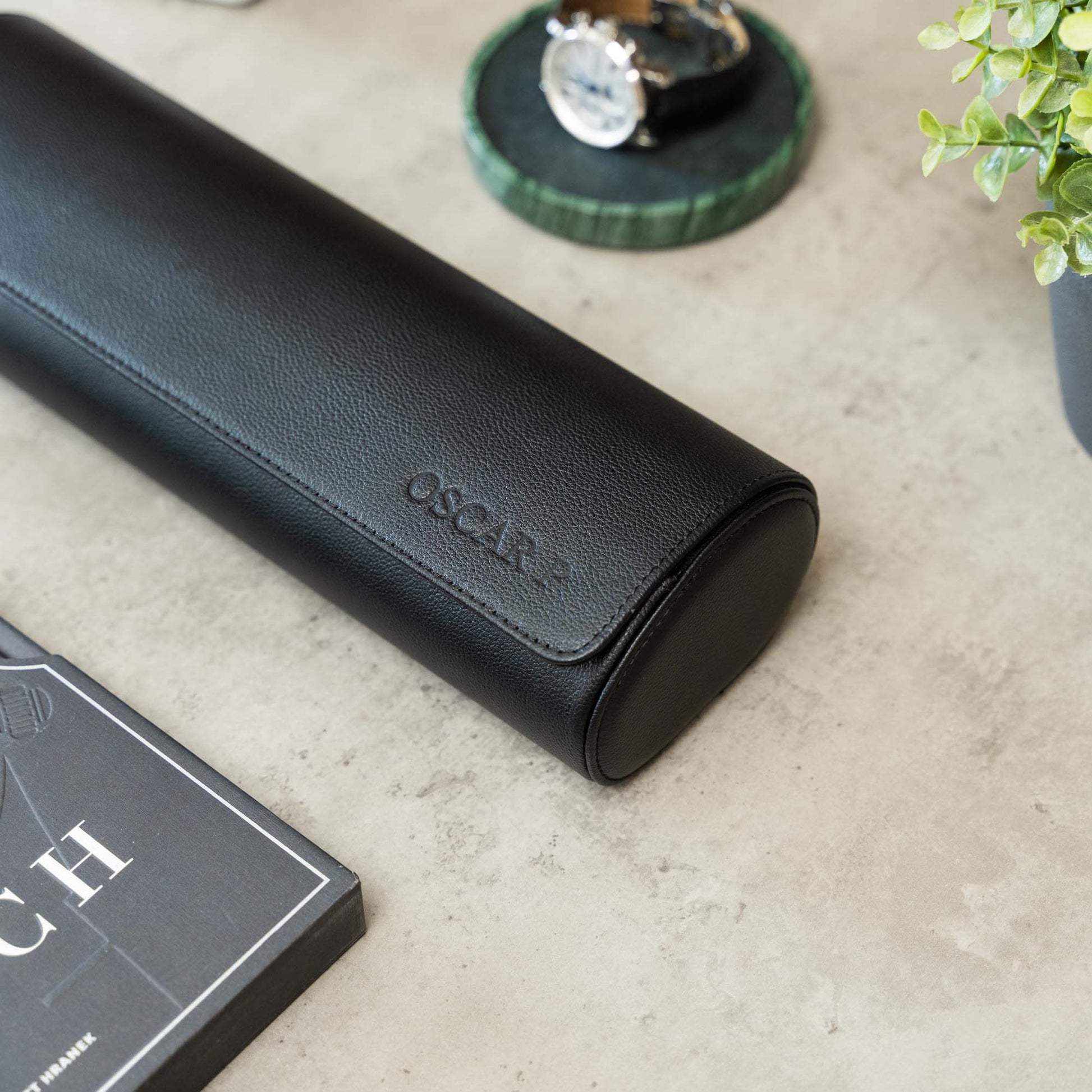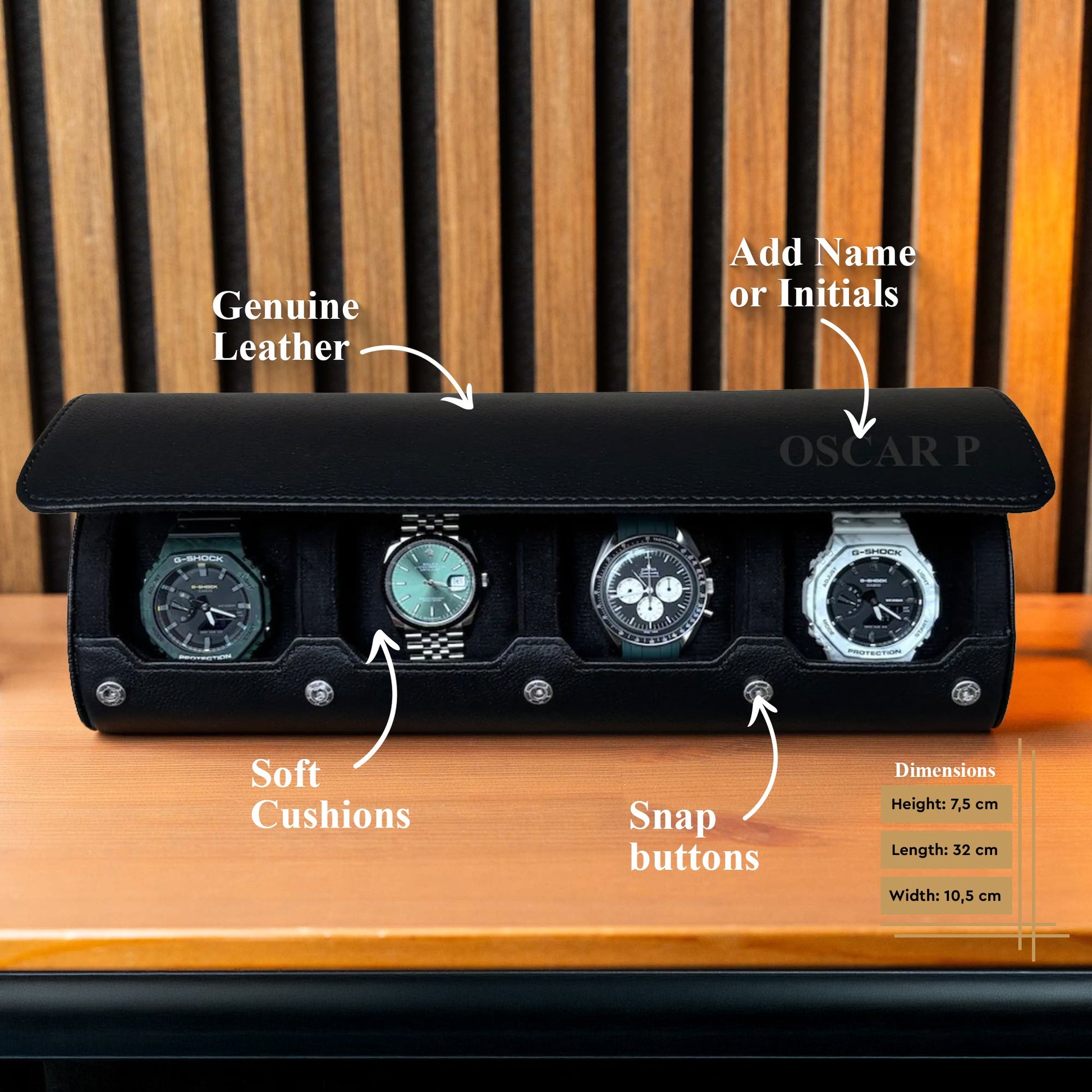 This Extra Large Travel Roll is hand made of fine black genuine leather and holds up to four watches. Ideal to carry your prized possessions with you on any occasion, or to store it at home. The pillow for each individual watch can be taken out.