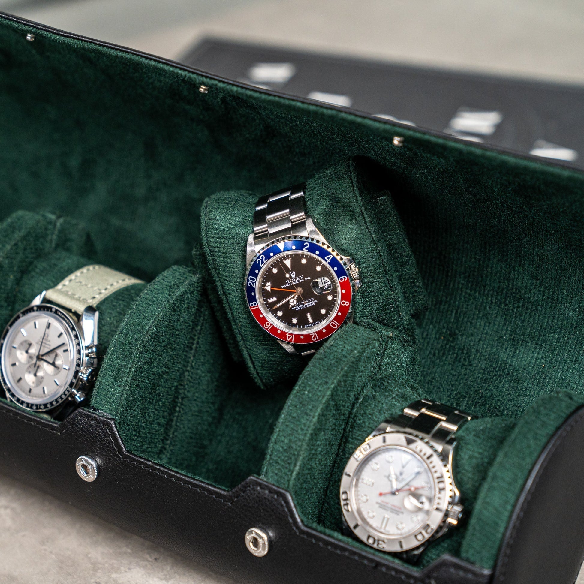 This Extra Large Travel Roll is hand made of fine black genuine leather and holds up to four watches. Ideal to carry your prized possessions with you on any occasion, or to store it at home. The pillow for each individual watch can be taken out.