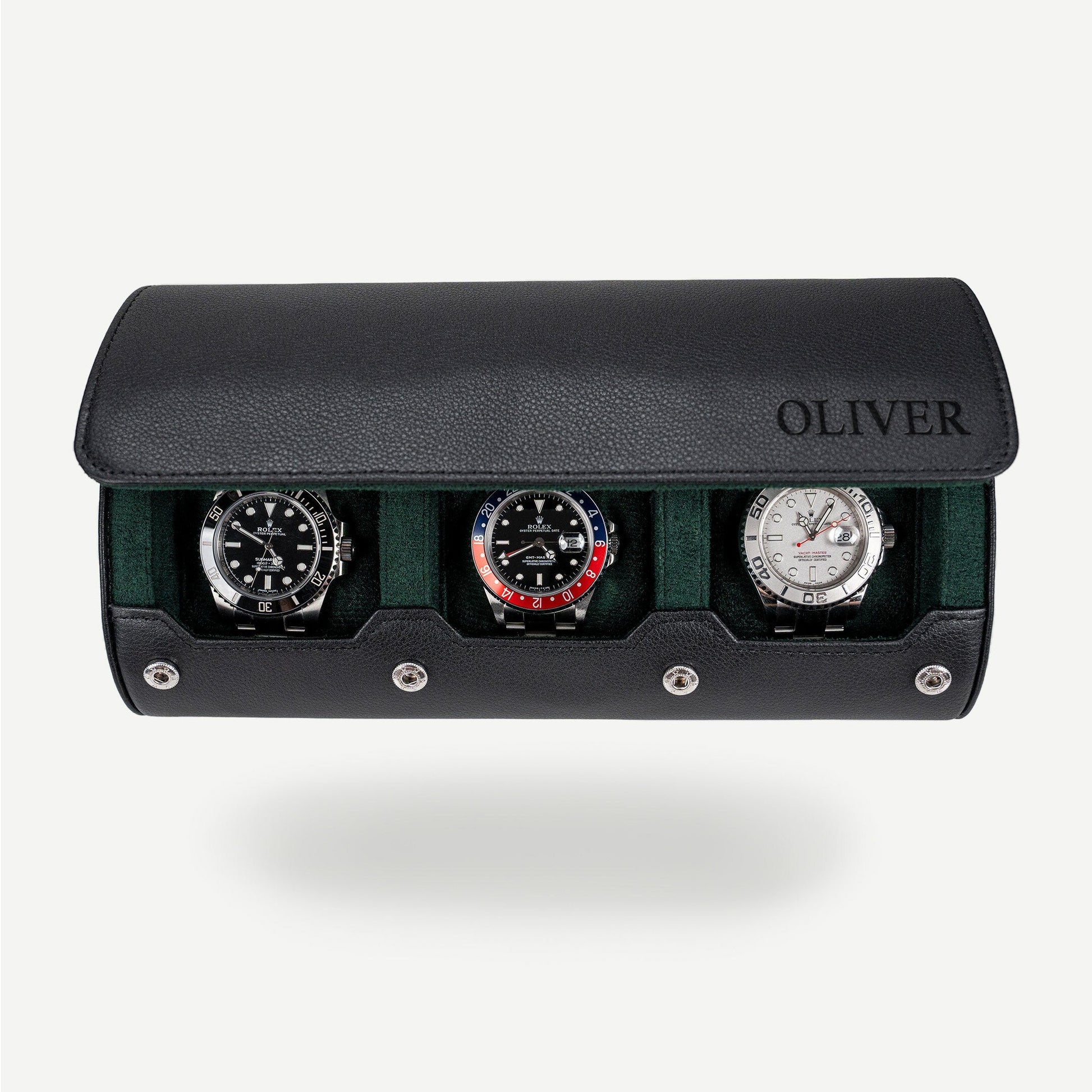 The Large Watch Roll is handmade of fine black genuine leather and holds up to three watches. The Watch Roll is ideal to carry your favourite watches with you on any occasion, or for daily storage.