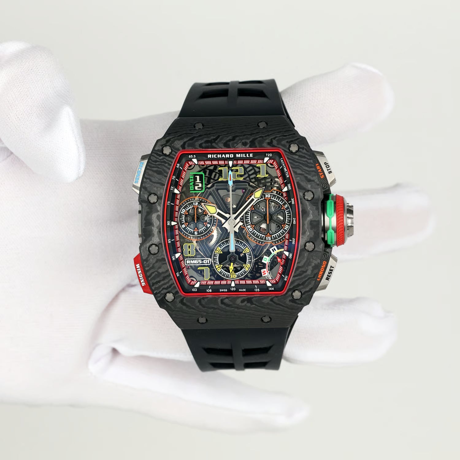 A bold statement in luxury watchmaking. The RM 65-01 features a multi-layer carbon case, intricate skeleton dial, and precision chronograph movement. Designed for those who demand exclusivity and performance in every detail.
