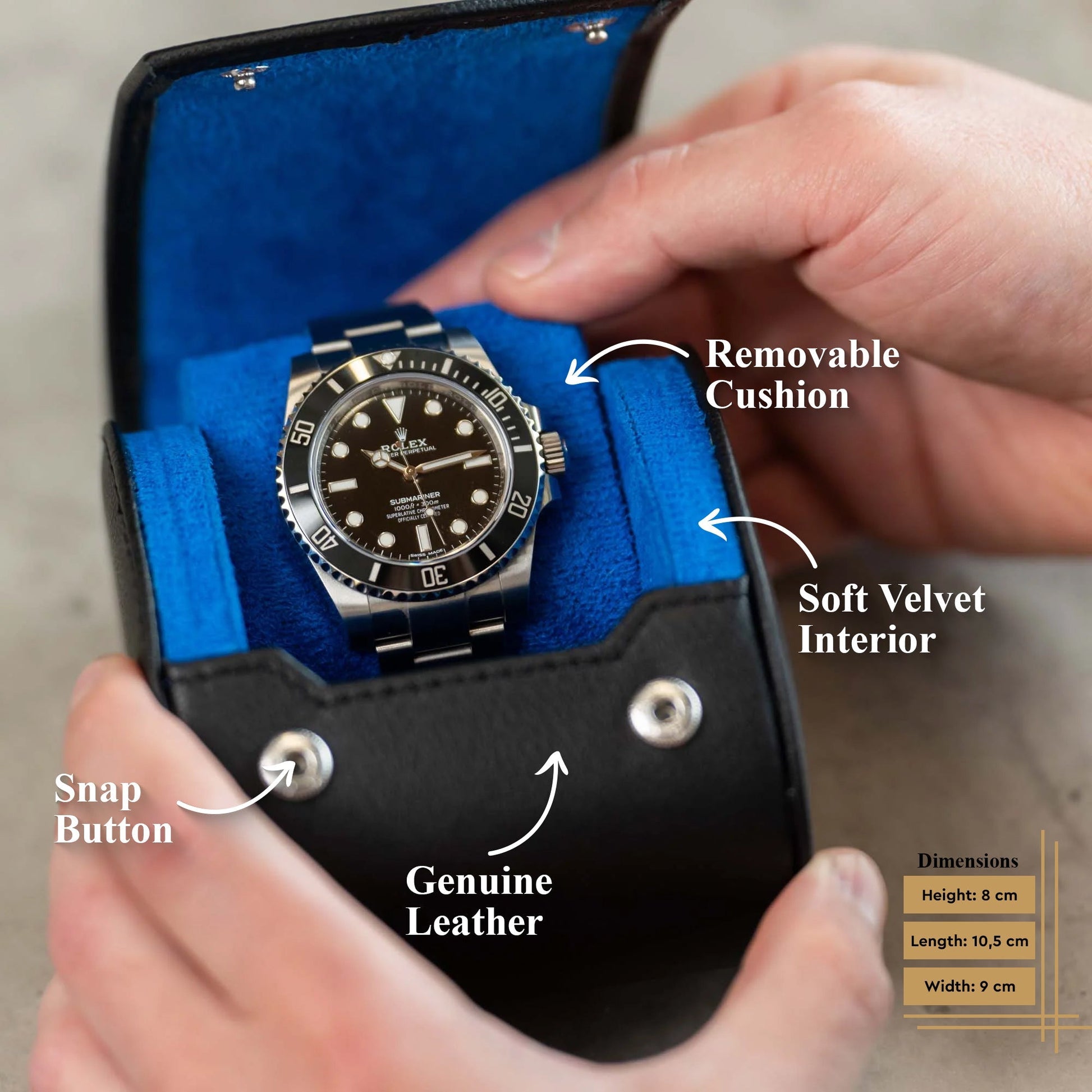 The single watch roll is the perfect home for your favourite watch, it is ideal to carry your watch with you on any occasion, or for daily storage. It is handmade with fine black genuine leather.