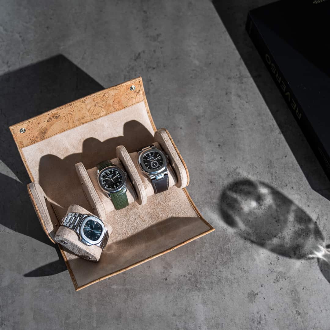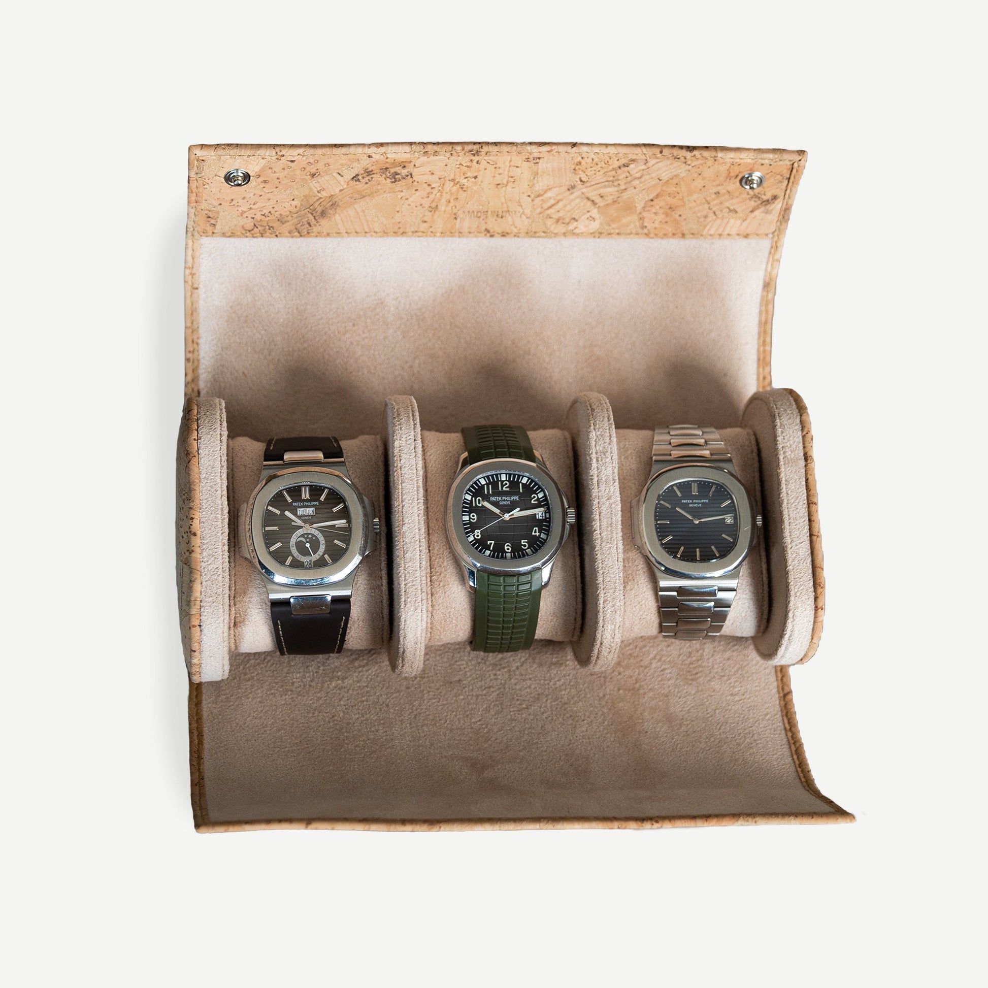 This three slot watch roll is handmade in Tuscany, Italy with premier craftsmanship and locally sourced cork leather for the exterior finish ensuring your watches are safely stored and protected.